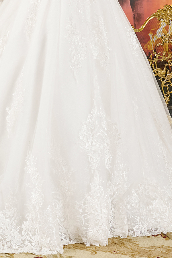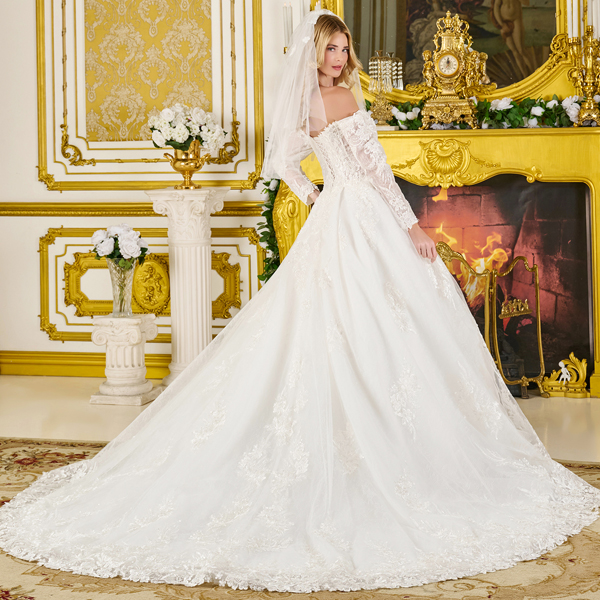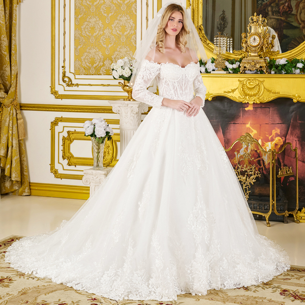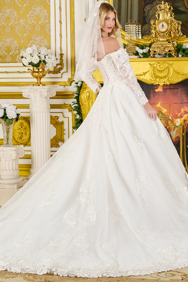 Exquisite wedding ball gown adorned with delicate appliques, intricate embroidery, beads, and shimmering sequins. A lace underlayer beneath soft mesh adds texture and depth to the design. The off-shoulder 3/4 sleeves elegantly frame a sweetheart neckline corset bodice, creating a classic silhouette. Flowing from the bodice, the voluminous skirt features an embroidered hem that adds a beautiful finishing detail.