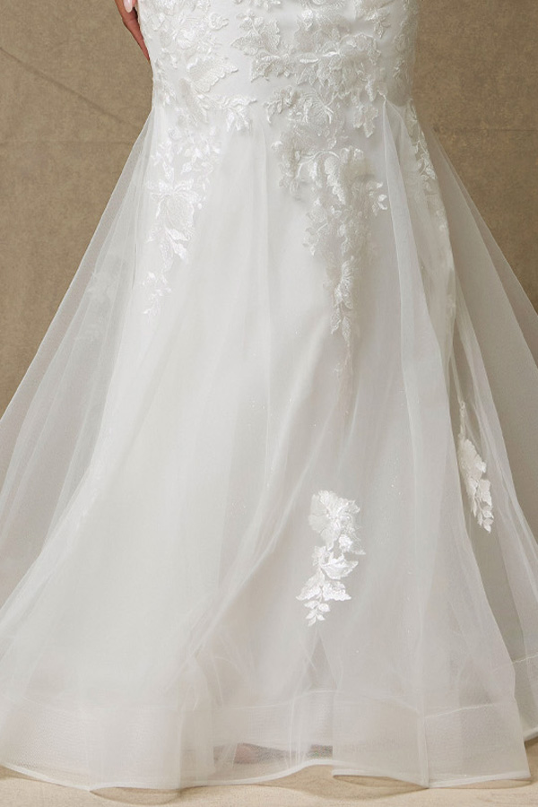 Features: Sweep Length, Veiled Illusion Top, Lace and Bead Detail, Horsehair Hem, Open Back, Zipper.