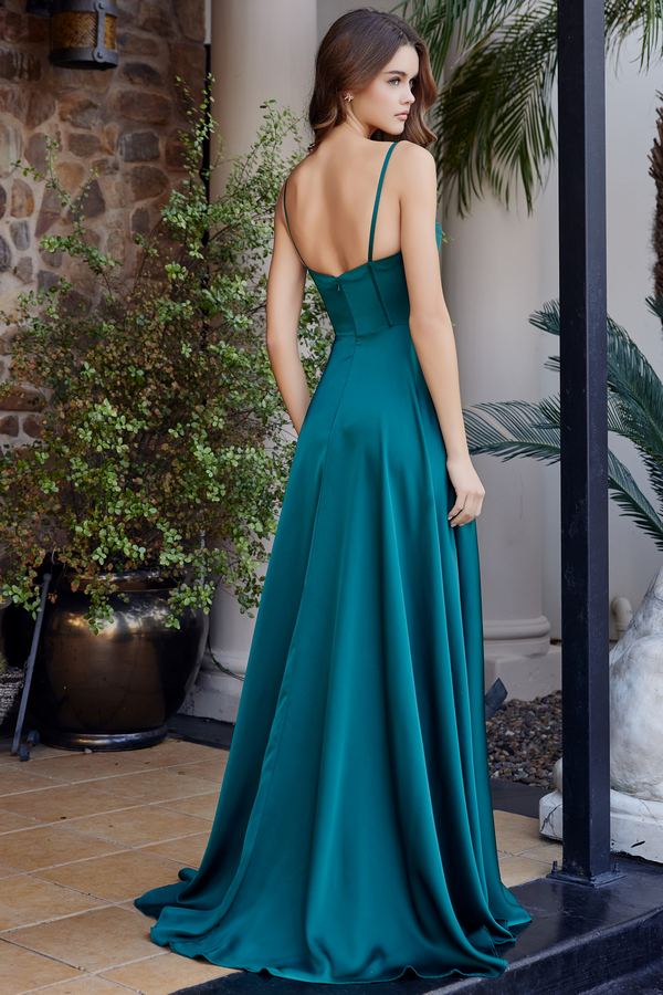 STRETCH SATIN A LINE DRESS WITH A SCOOP NECKLINE AND SPAGHETTI STRAPS BONED BODICE OFFERS STRUCTURE AND SHAPE WHILE A THIGH HIGH SLIT ADDS AN ALLURING TOUCH OF DRAMA, COMPLETE WITH LACE UP BACK CLOSURE.