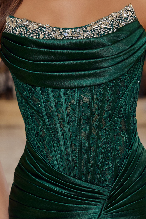 Features: Pleat Design, Open Back, Zipper Closure, Ruched Back, Laced Illusion Bodice.