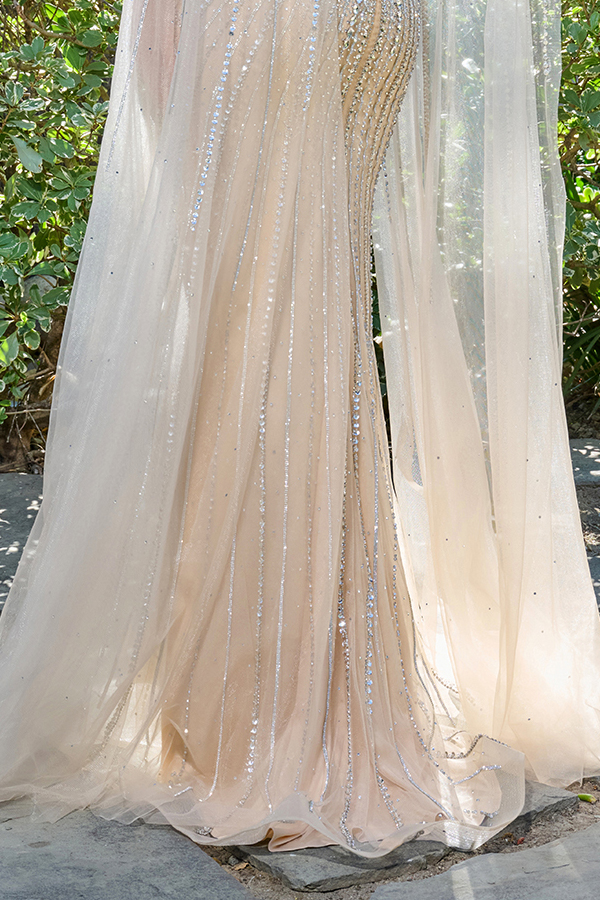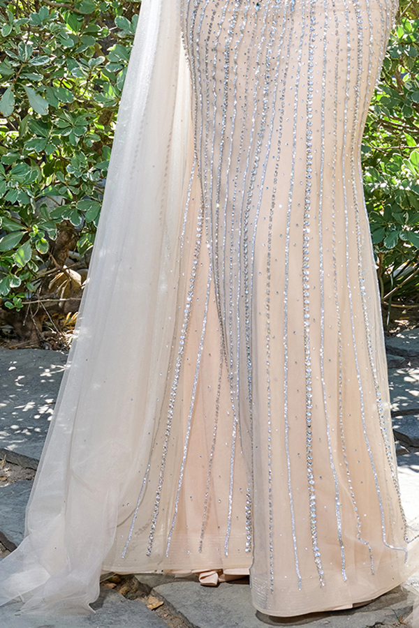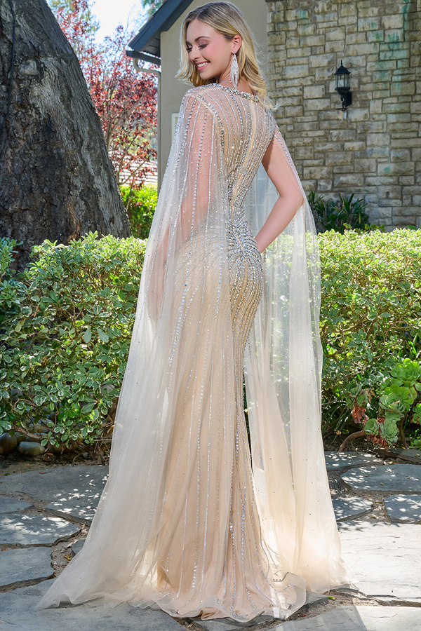 Make a sophisticated statement in this floor-length fitted evening gown, beautifully embellished with sparkling beads, jewels, and sequins for a radiant finish. The elegant Queen Anne neckline adds a regal touch, while sheer cape sleeves drape softly over the shoulders. A concealed back zipper ensures a seamless fit, completing this refined look that's perfect for prom, pageants, or any formal event.