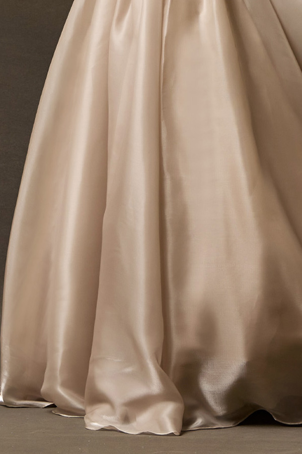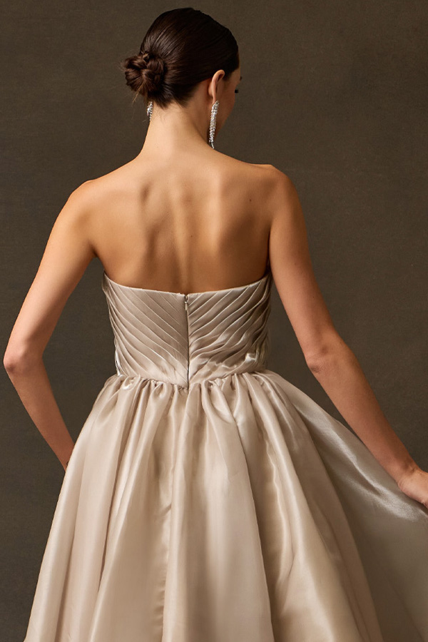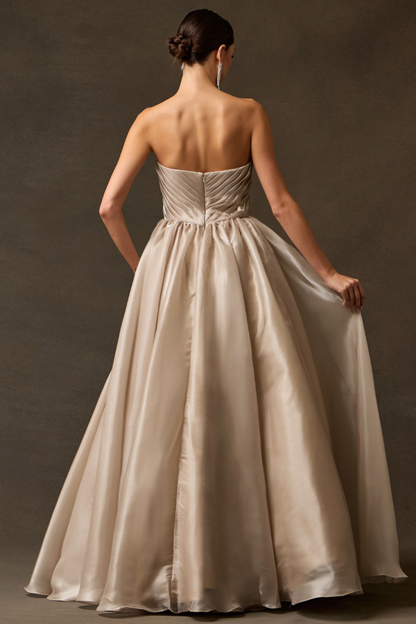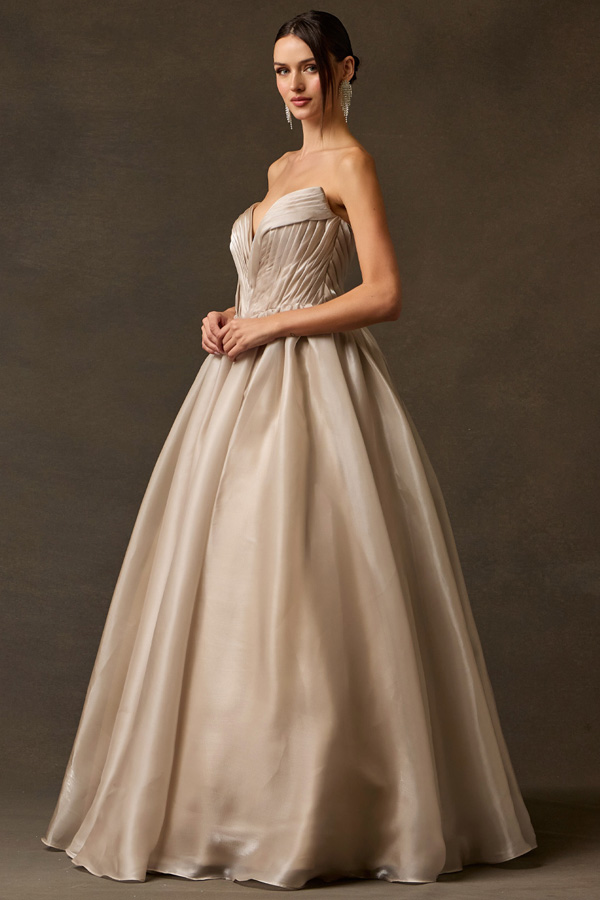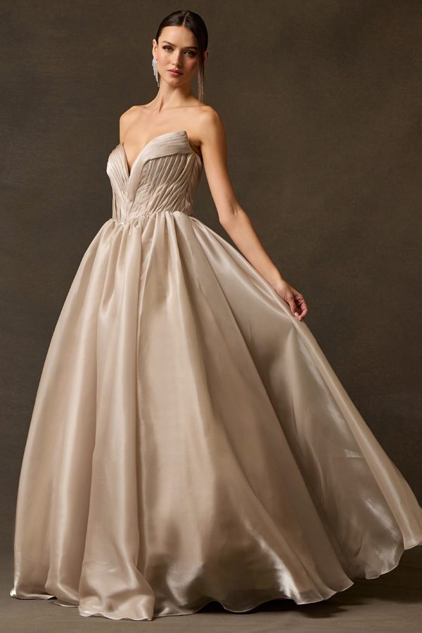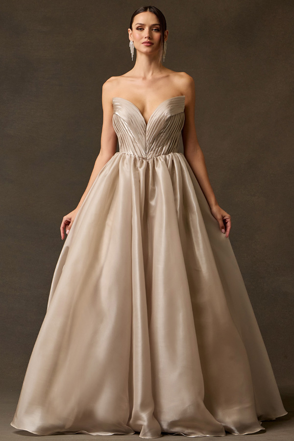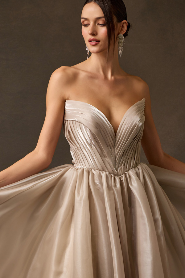 Features: Archtectural Pleating, Deep V-Plunge Neckline, Radiant Shimmer Charmeuse Fabric, Dramatic Volume, Clean Back Design