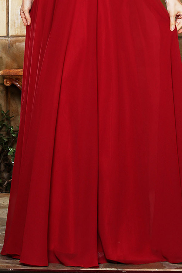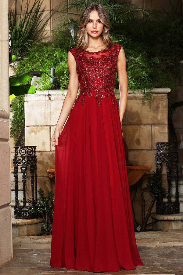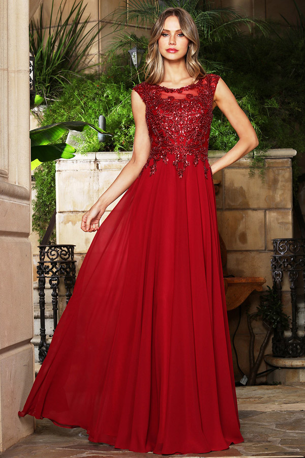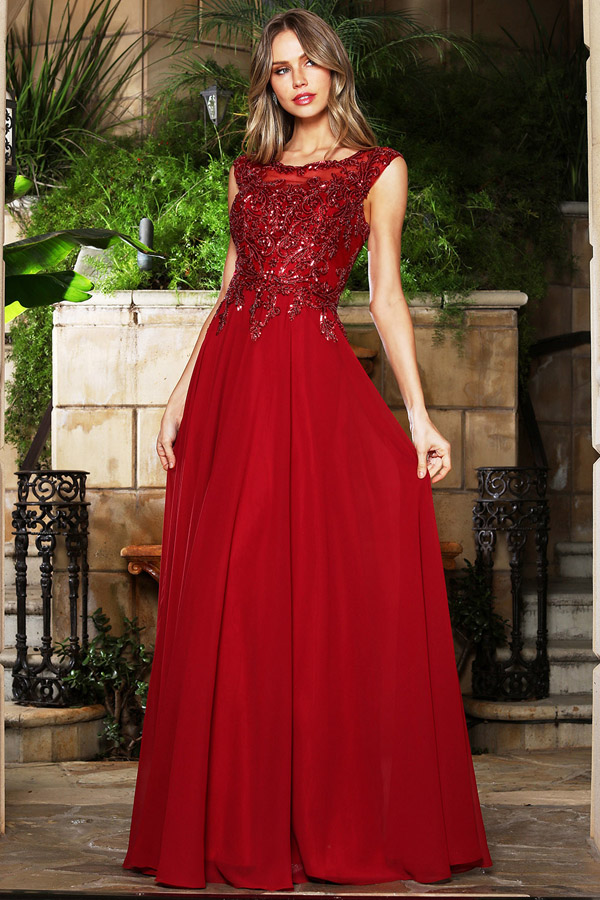 Color: BURGUNDY Size:- Embroidered Lace Illusion Chiffon MoB Gown