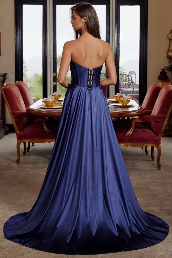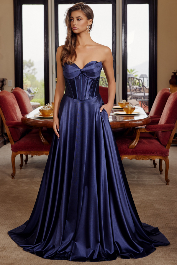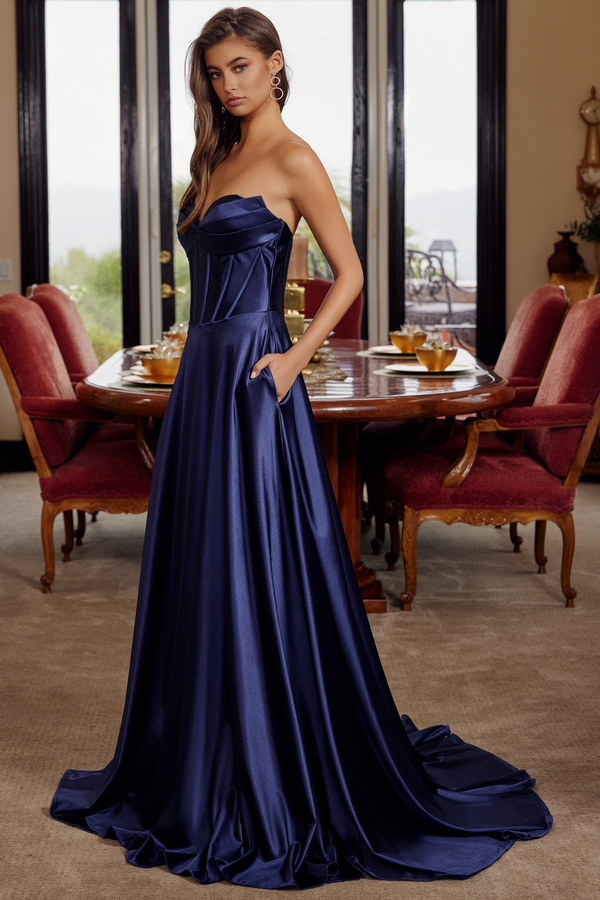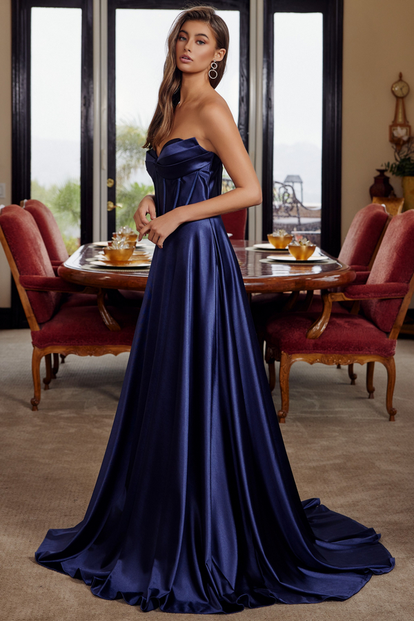 - Strapless Pleat Bustline A Line Satin Dress