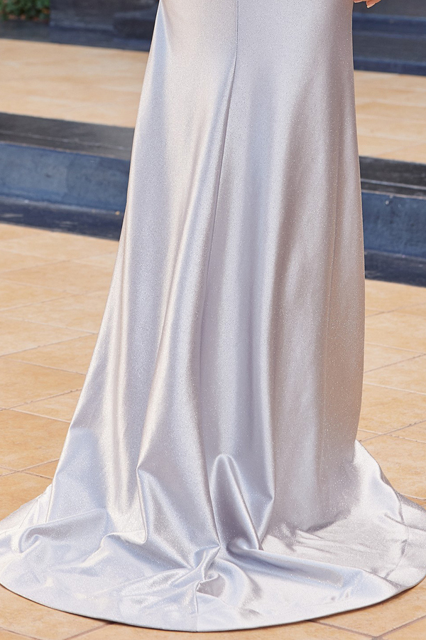 GLITTER DUSTED STRETCH SATIN GOWN CATCHES THE LIGHT FROM ALL ANGLES THE BONED BODICE WITH ILLUSION PLUNGE AND LACE UP BACK IS EMBELLISHED WITH SEQUINS THE FLOOR LENGTH SKIRT OPENS TO A THIGH HIGH SLIT.