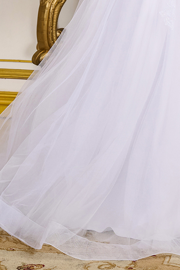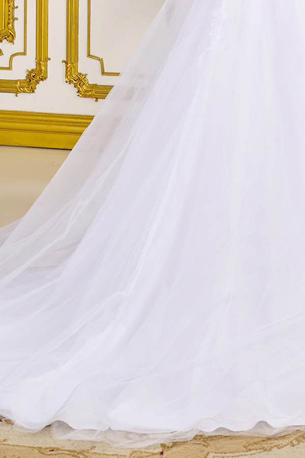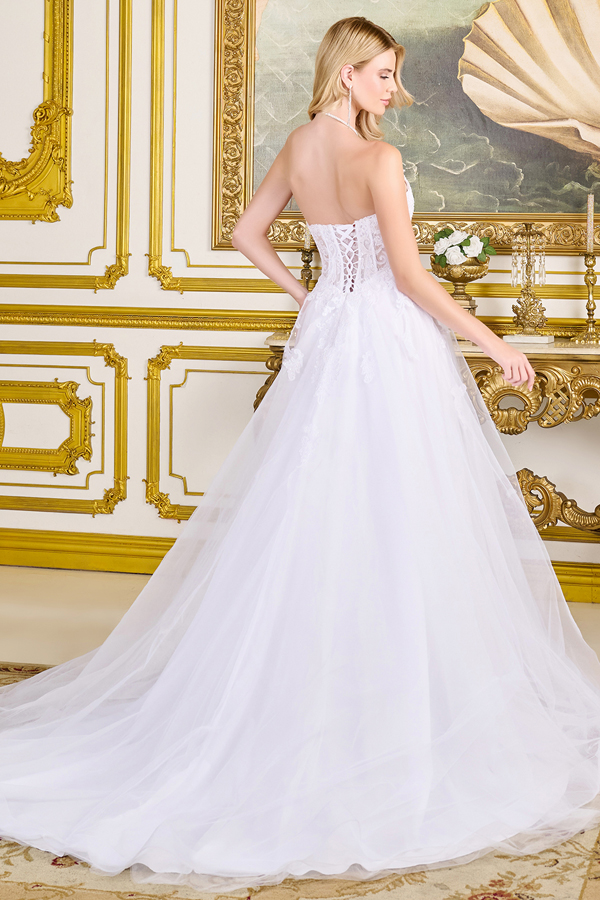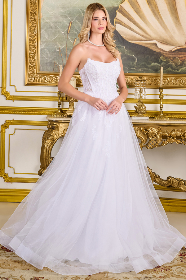 - Strapless Boat Peaked Neckline A Line Wedding Gown