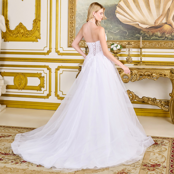 A-line wedding gown is beautifully embellished with intricate embroidery, shimmering sequins, and delicate beadwork. The strapless bodice features a boat neckline and a structured corset design, offering a flattering silhouette and secure fit. A lace underlayer adds dimension, while the Basque waistline gracefully elongates the torso and transitions into a flowing mesh skirt. A perfect blend of classic elegance and modern detail.