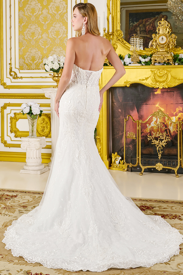 Eexquisite trumpet silhouette wedding gown. Designed with a romantic strapless sweetheart neckline, the structured corset bodice contours the figure and flows effortlessly into a fit-and-flare skirt. The entire gown is richly adorned with intricate beadwork, floral appliques, shimmering sequins, and delicate embroidery, layered over a soft lace underlay, and the scalloped lace hemline The dress includes a matching long-sleeved bolero jacket.