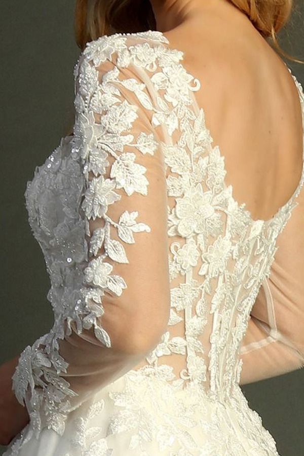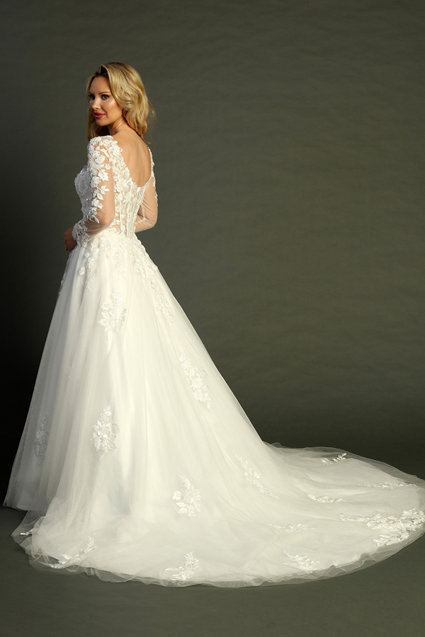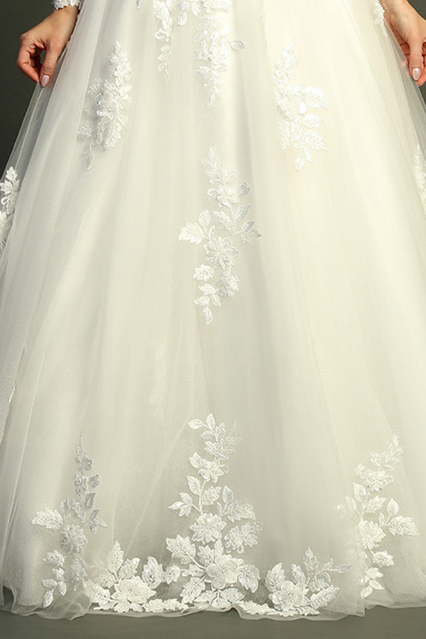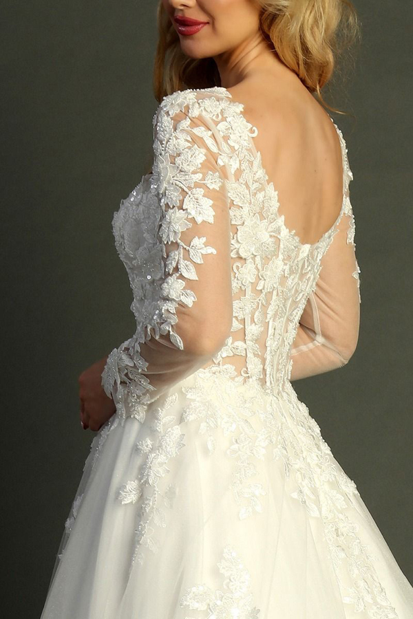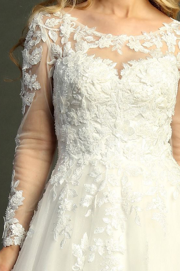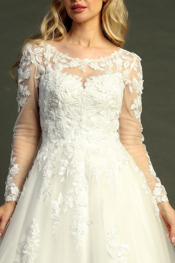 - Sheer Long Sleeve Bateau Neckline A Line Wedding Gown
