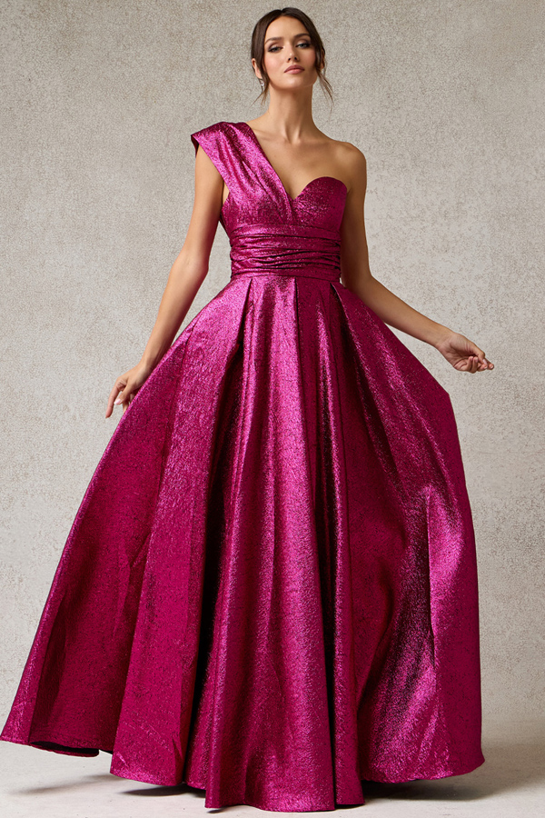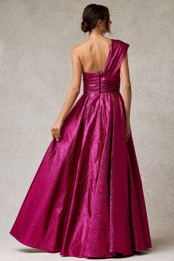 Asymmetric Floor Length A Line Jacquard Dress with Pleat Detail.
