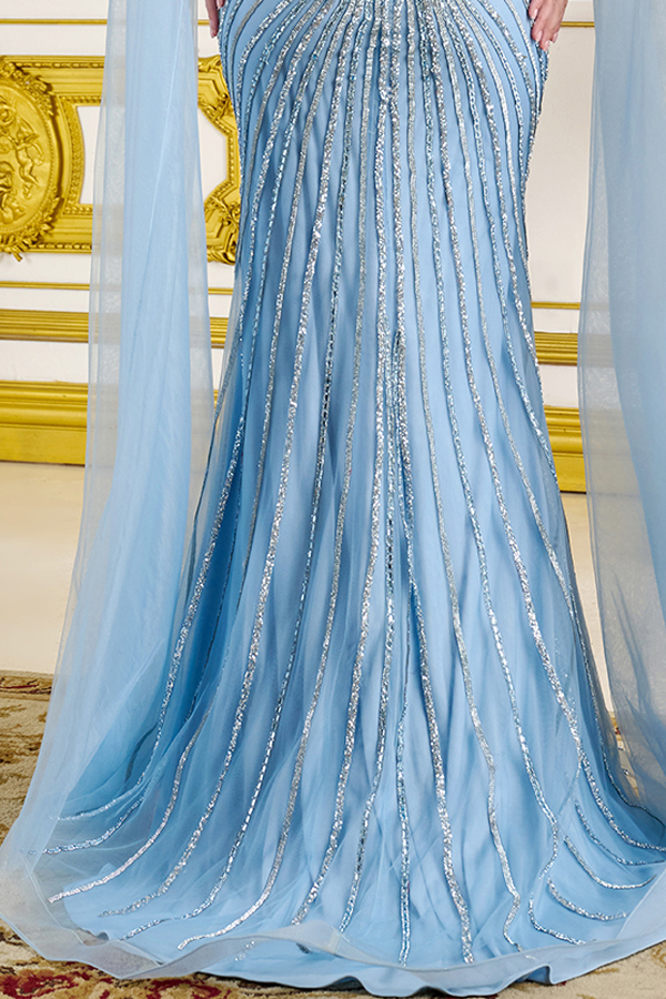 Radiant and glamorous, this strapless fitted gown is embellished with shimmering lines of jewels that trace the bodice and create the look of a faux Basque waistline. Sheer mesh cutouts accent the sides, adding a sultry touch that continues seamlessly to the back. Completing the look, a matching open-back cape adorned with sparkling jewels drapes beautifully over the shoulders, making this style an unforgettable choice for any formal event.