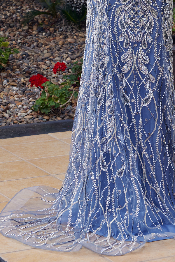 FITTED TULLE GOWN FULLY EMBELLISHED WITH WOVEN BEADS FOR COUTURE LEVEL SHIMMER A PEAKED NECKLINE AND SLIM SPAGHETTI STRAPS OFFERS A MODERN LOOK WHILE THE THIGH HIGH SLIT OFFER A LEG LENGTHENING EFFECT