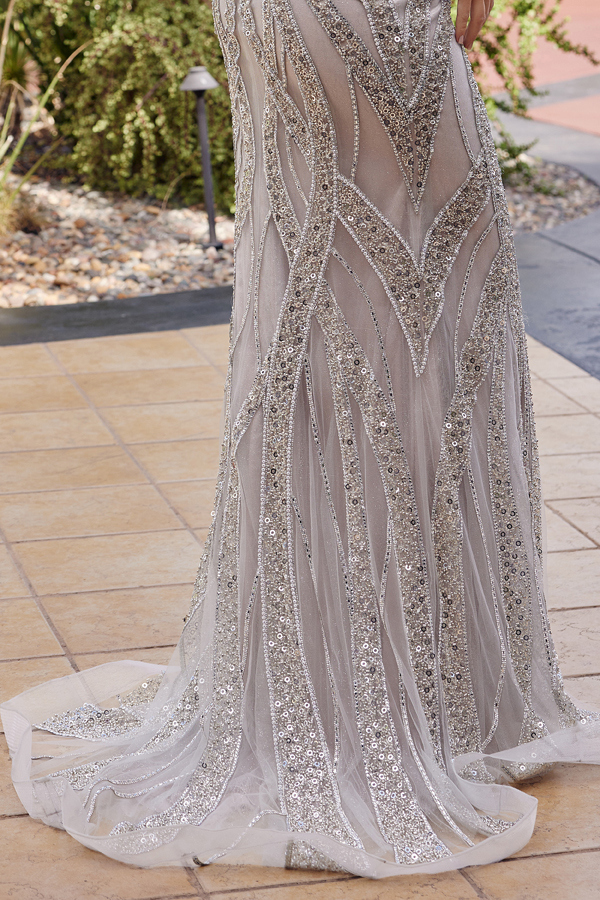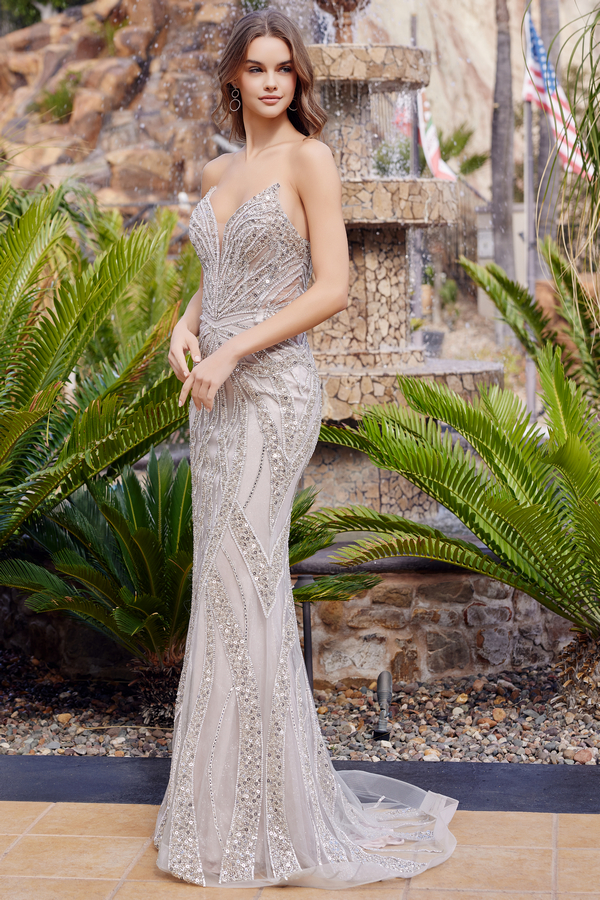 STRAPLESS FULLY SEQUINED AND BEADED FOR A DIMENSIONAL SPARKLE FROM EVERY ANGLE A PEAKED NECKLINE LENGTHENS THE UPPER BODY AND DEFINES THE NECKLINE A LACE UP BACK ALLOWS FOR A FIGURE HUGGING SILHOUETTE.