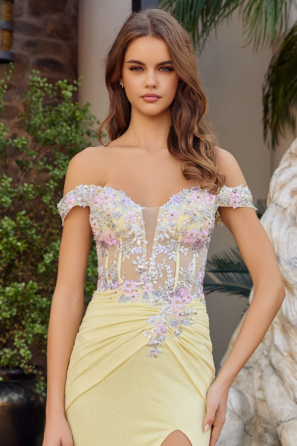 FITTED FULL SHIMMER JERSEY GOWN WITH A DEEP V SWEETHEART NECKLINE THE BONED BODICE HAS OFF SHOULDER SLEEVES AND A LACE UP BACK COVERED IN STUNNING WOVEN EMBELLISHMENTS COMPLETE WITH A THIGH HIGH SLIT.