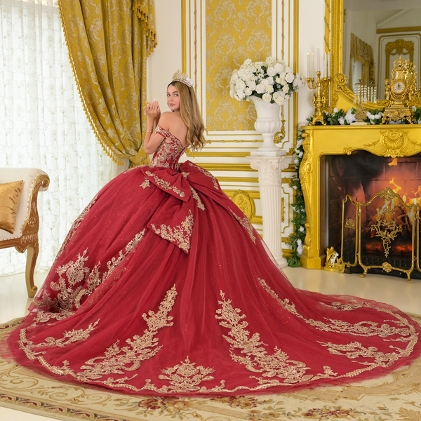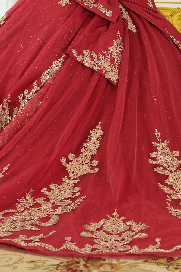 Off-Shoulder Embellished V-Neckline Corset Bodice Train Ball Gown With Detachable Bow.
