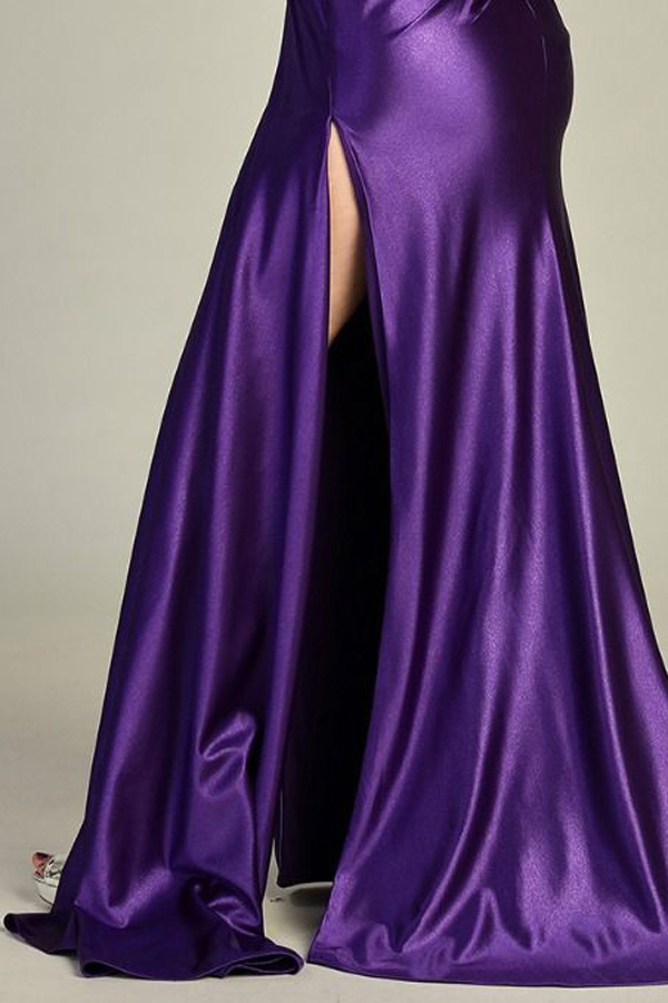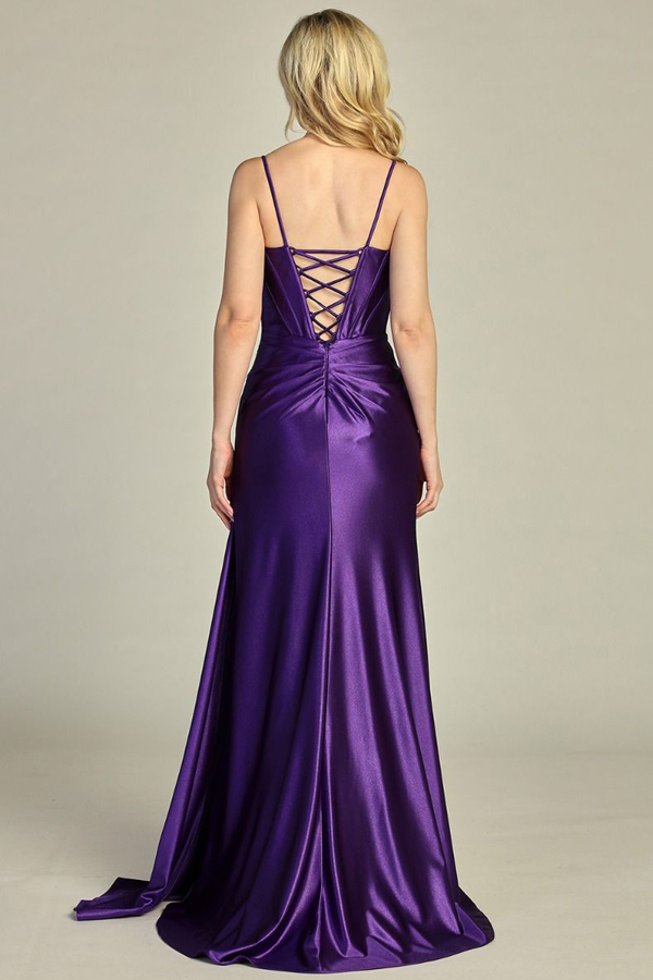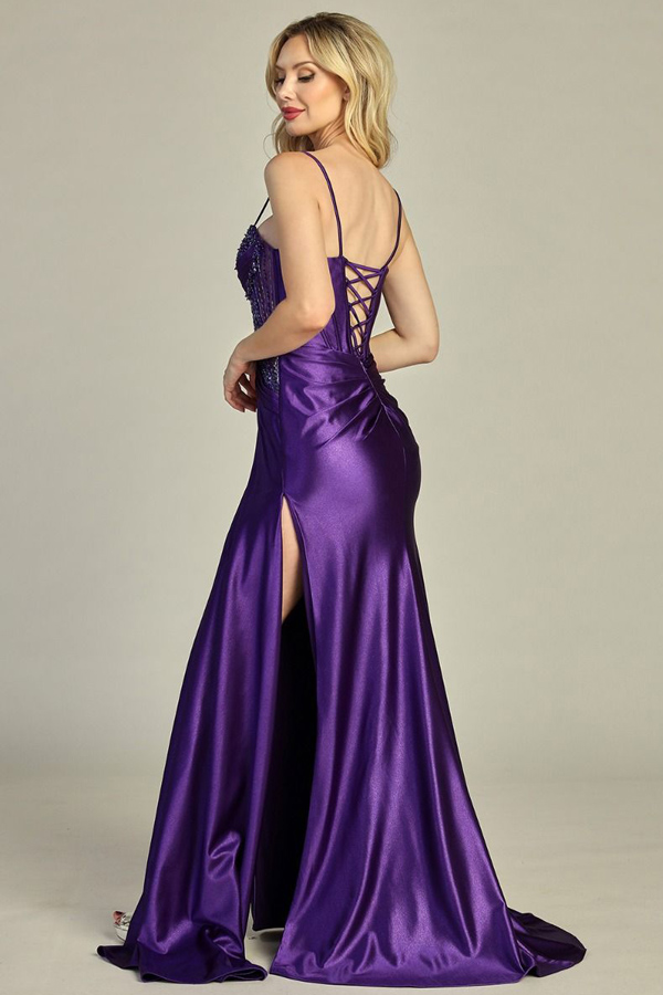 Features: Bead Works, Asymmetric Setup, Lace-Up Fit with Pleat Detail, Daring Thigh-High Side Slit. Sweep Length.