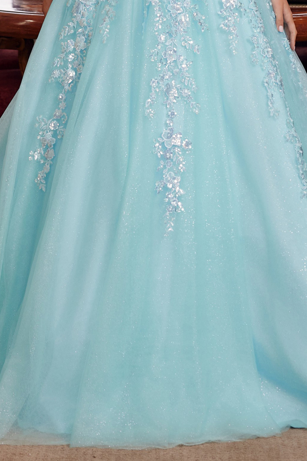 STUNNING BALL GOWN FEATURING OFF SHOULDER STRAPS AND A PLUNGING V NECKLINE WITH A SHEER BONED WAISTLINE FULLY EMBROIDERED BODICE BACK ZIPPER AND A COURT TRAIN.