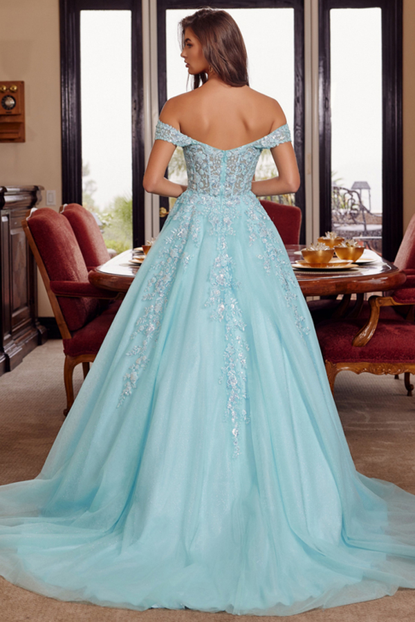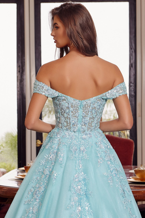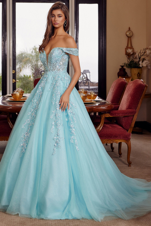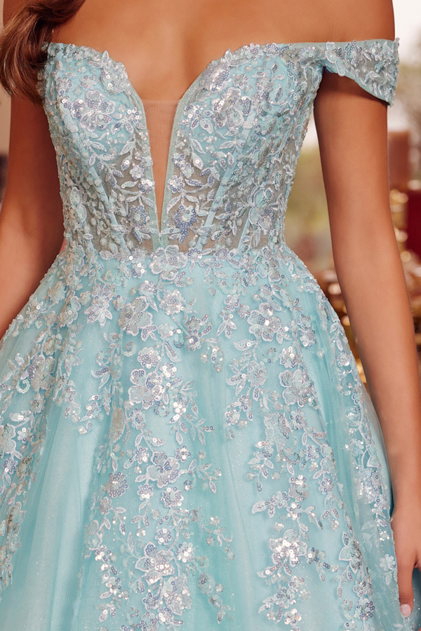 - Off Shoulder Plunging V Neck Sheer Top A Line Gown