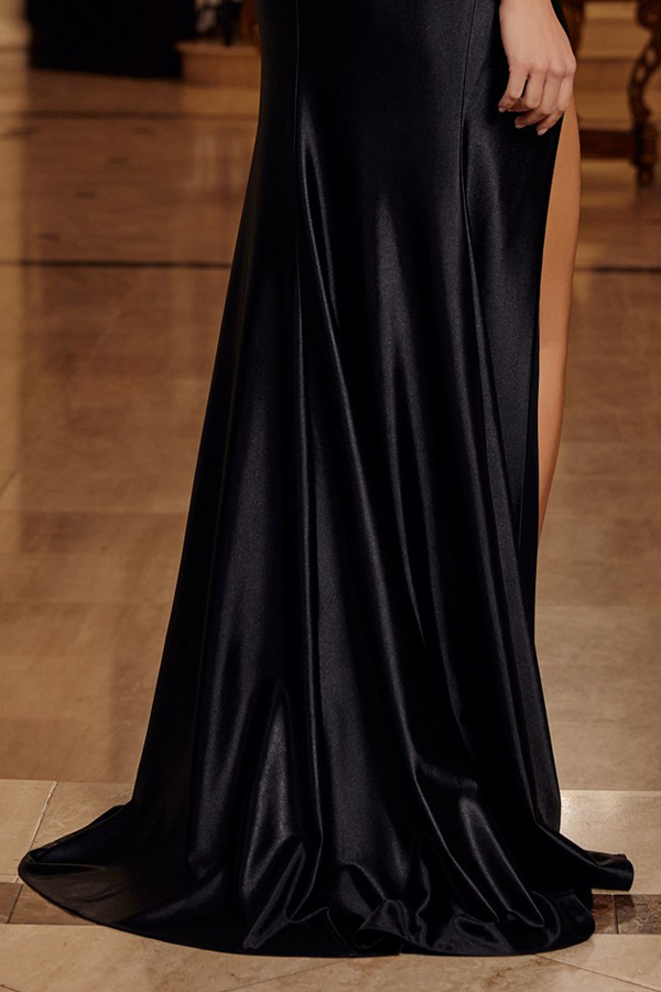SPAGHETTI STRAPS V NECKLINE BEAD/SEQUIN APPLIQUE BODICE CRAFTED WITH SHINY SATIN FEATURING A CRISSCROSS WAISTLINE DESIGN AND DOUBLE BRA LIKE BACK CLOSURE WITH LEG SLIT AND A SWEEPING TRAIN.