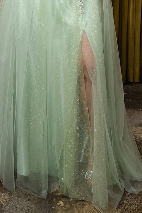 Features: Sequin Embroidery, Stone Strips, Trendy V-neckline, Bone-In Illusion Top, Glitter Sparkle Tulle Overlay.