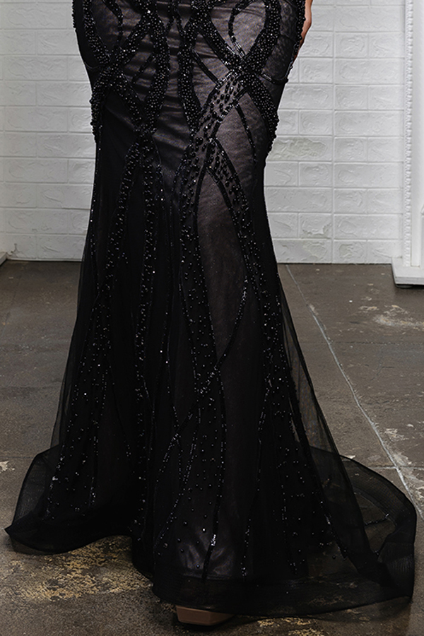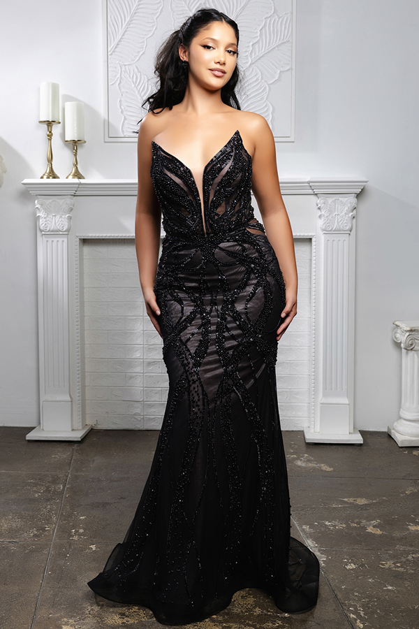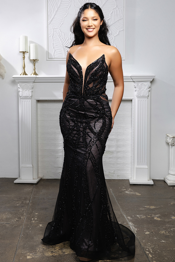 Sleeveless Strapless Plunging V Neckline Embellished Mermaid Dress