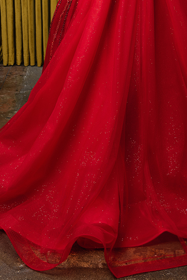 Features: Jewel/Bead Detail, Glitter Sparkle, Design Neckline, Bone-In Illusion Setup.