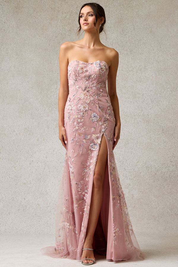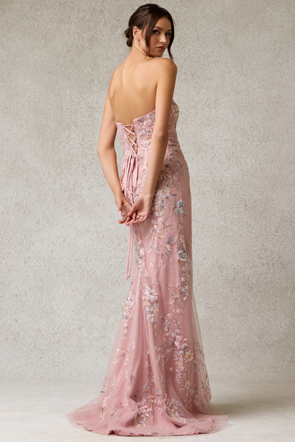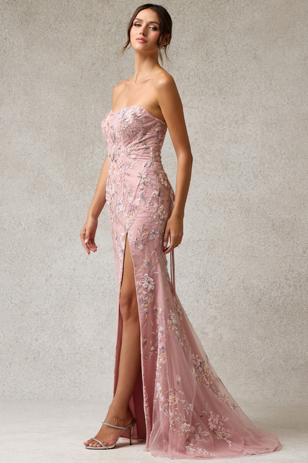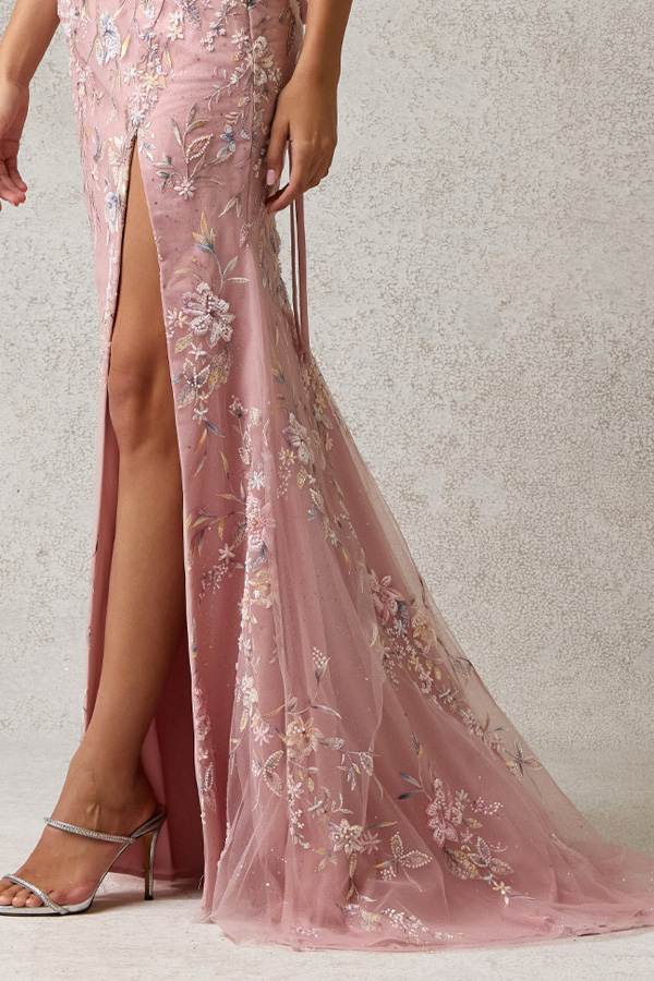 Features: Floor Length, Embellished Tulle Overlay. Thigh-High Slit.