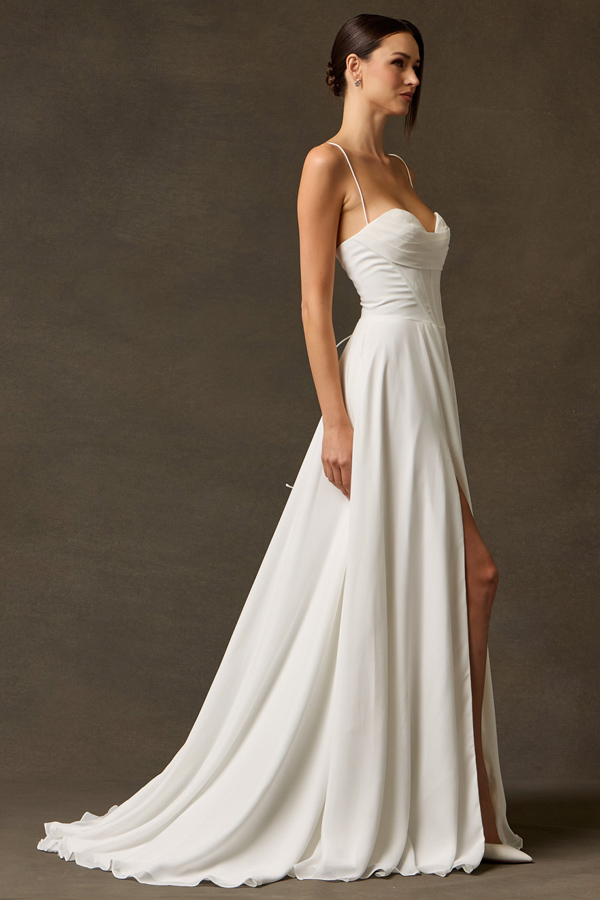 Features: Cowl Design, Corset Top, Thigh-High Slit, Floor Length.