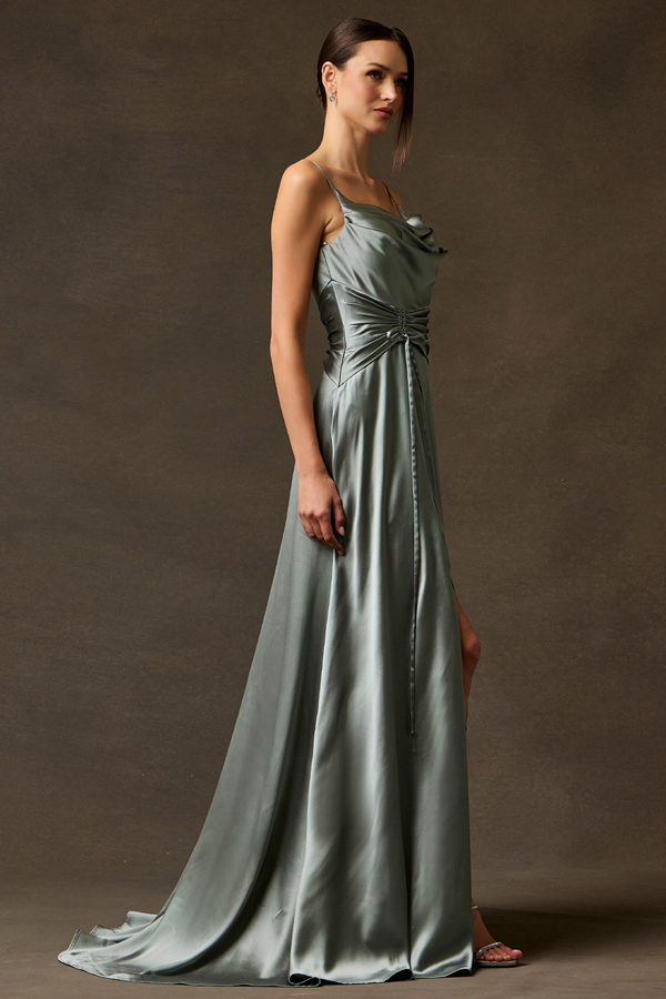 - Sleeveless Sweetheart Cowl Neckline A Line Satin Dress