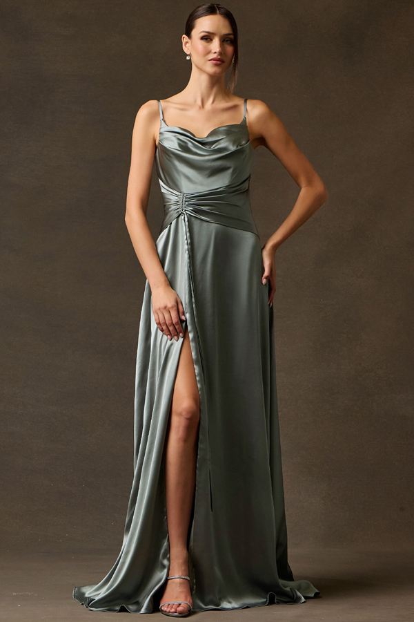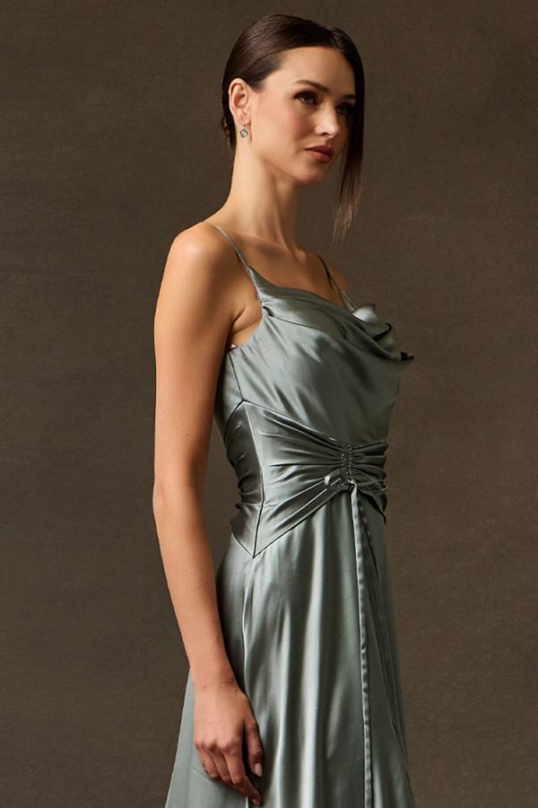 Sleeveless Spaghetti Straps Sweetheart Cowl Neckline A Line Satin Dress.