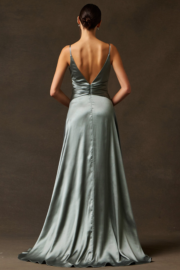 Features: Thigh High Slit, Pleat Detail, Deep V Back, Zipper Closure, Floor Length.