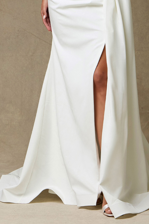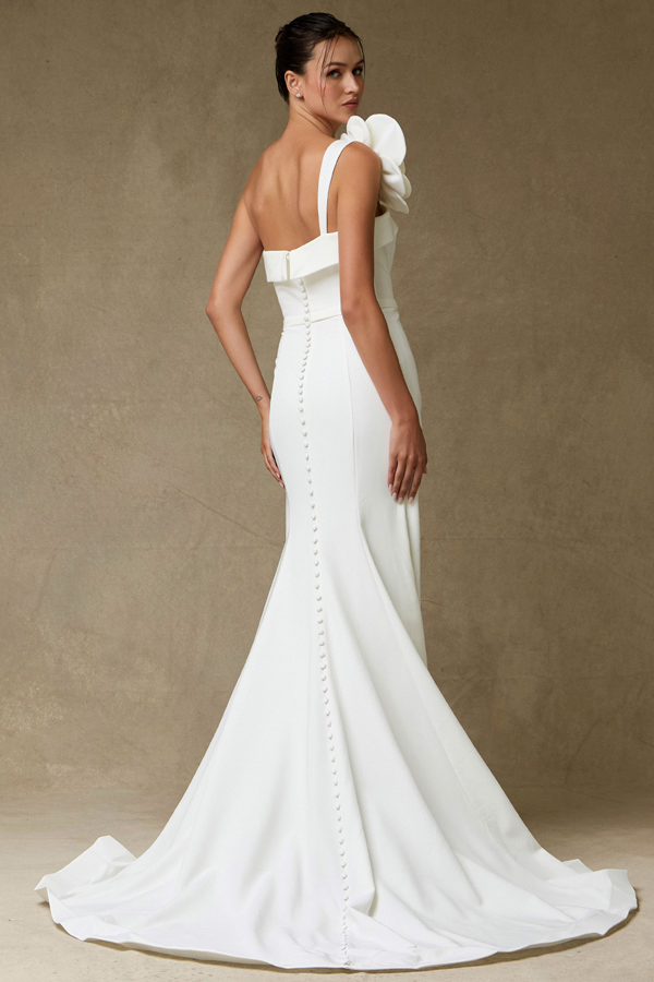 Features: Fold Down Neckline, Rosette One Shoulder, Thigh-High Slit, Pleat Design, Fabric Covered Buttons, Chapel Length.