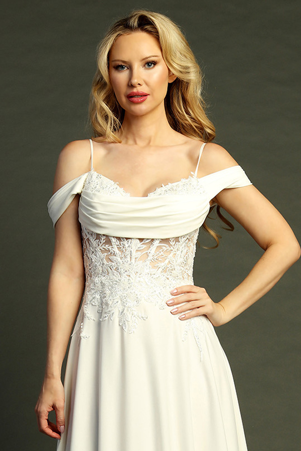 - Off Shoulder Cowl Neckline A Line Wedding Dress