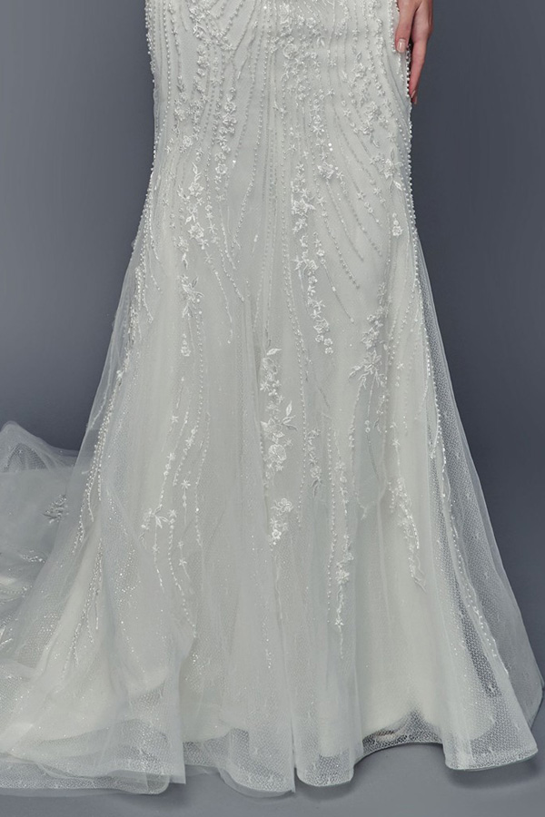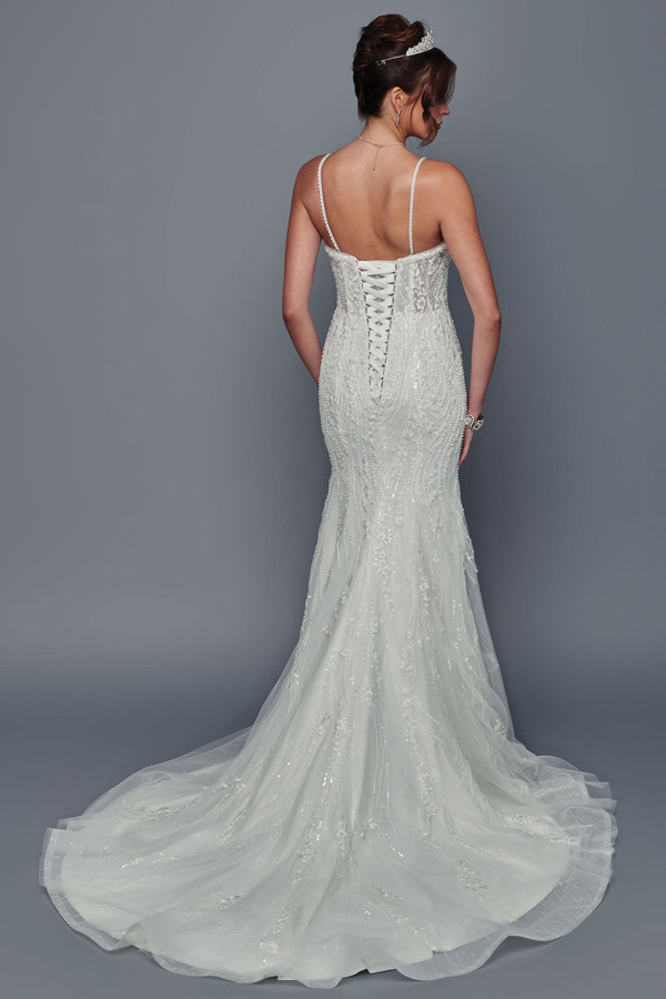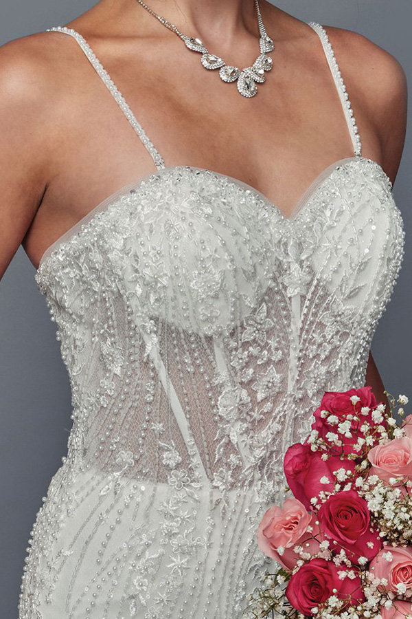 Features: Sheer Bodice, Trumpet Silhouette, Beaded Straps, Chapel Length Tail, Floor Length Front. Lace-Up Corset.