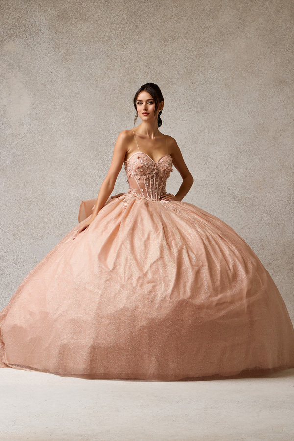 Step into a fairytale with this magnificent ball gown. Crafted in a romantic rose gold shimmer, this dress features a stunning juxtaposition of a structured, sheer corset bodice and a grand, multi-dimensional skirt. The intricate 3D floral appliqués and customizable sleeve options make it a versatile masterpiece for any grand entrance.