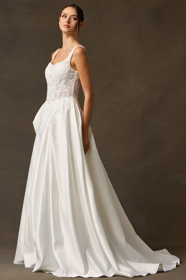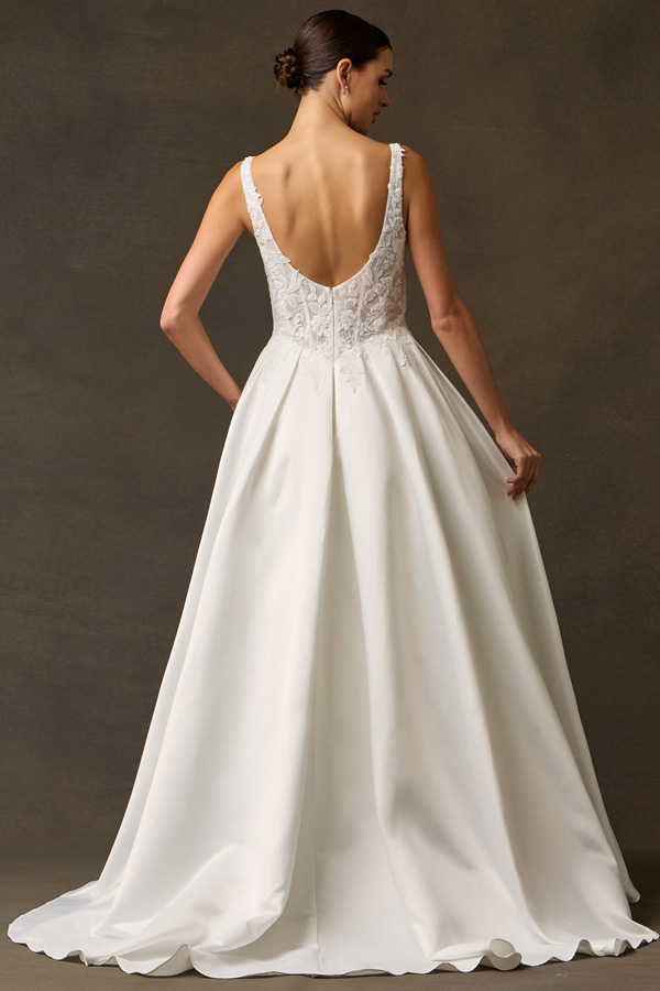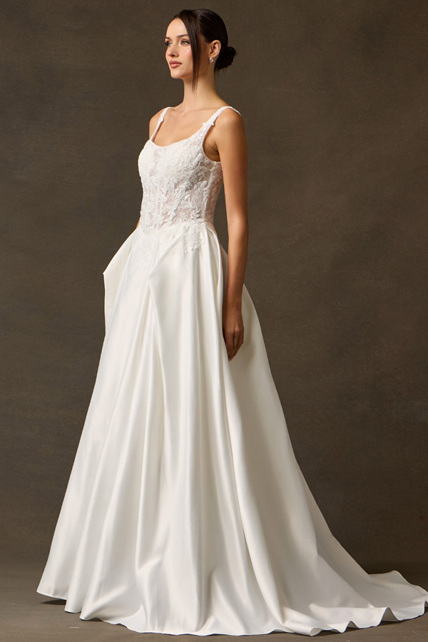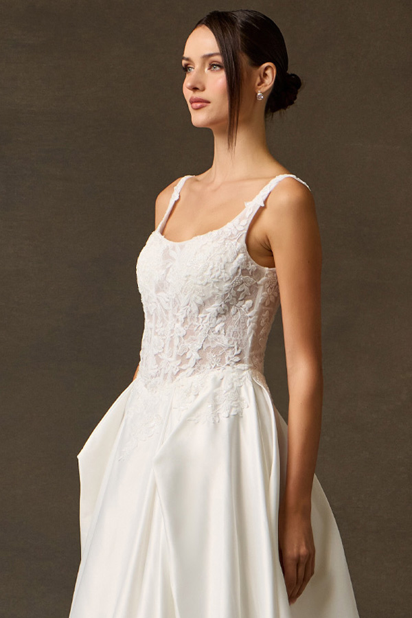 Features: Intricate Lace Bodice, Refined Scoop Neckline, Structured Mikado Skirt, Seamless Transition, Classic Chapel Train, Visible internal boning, built-in bust support, pleated waist.