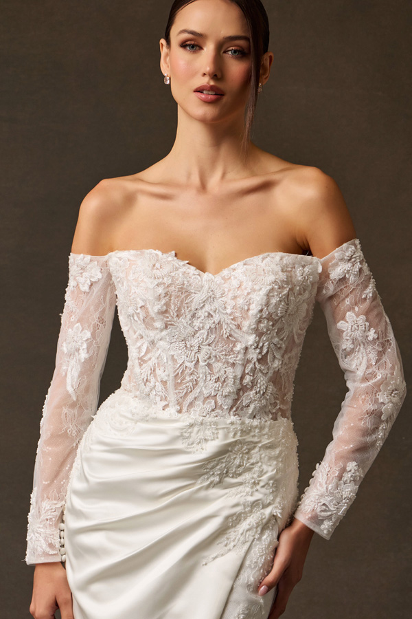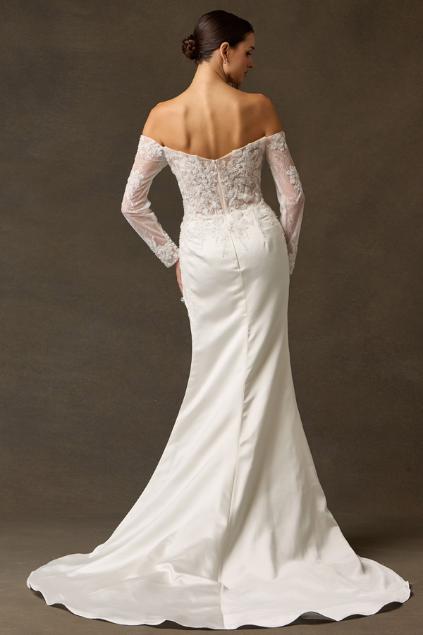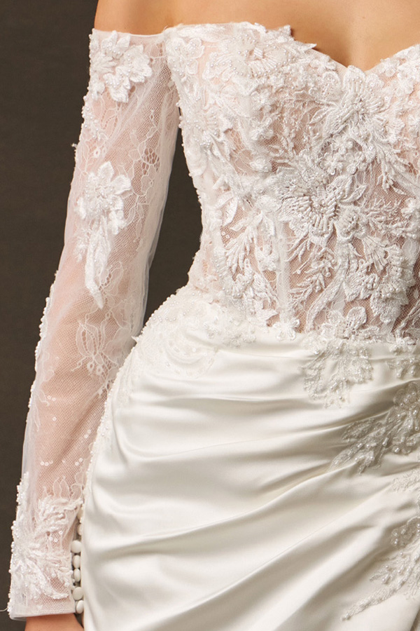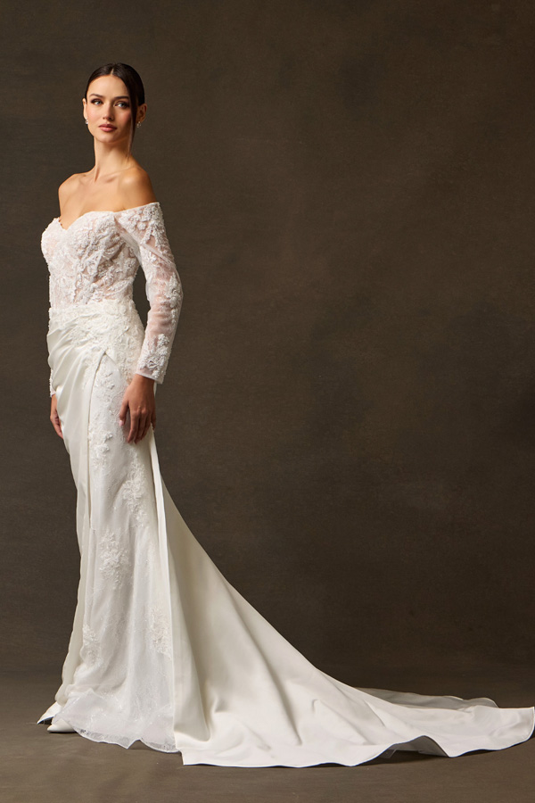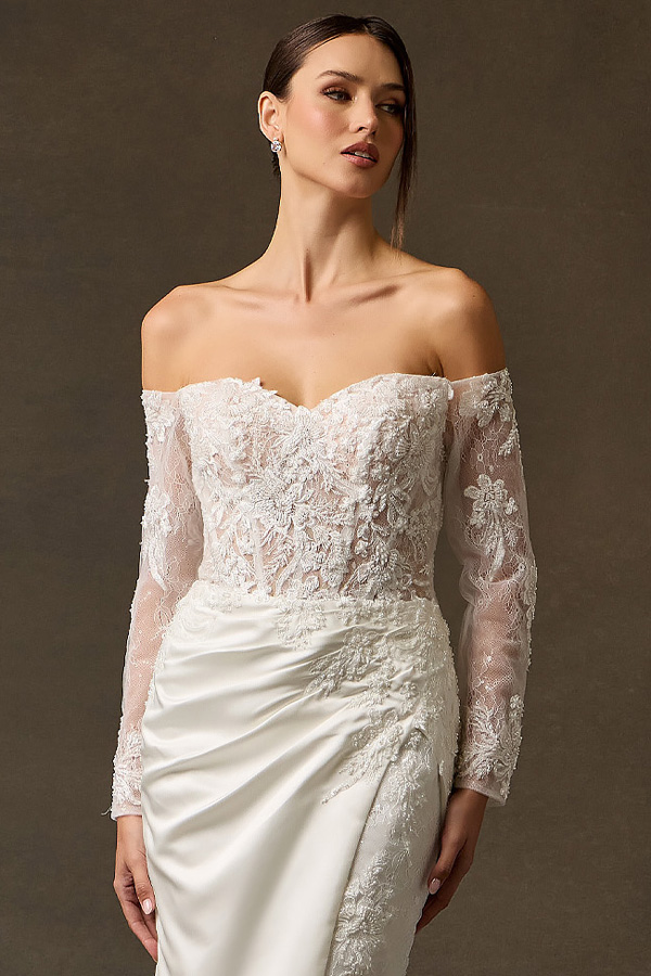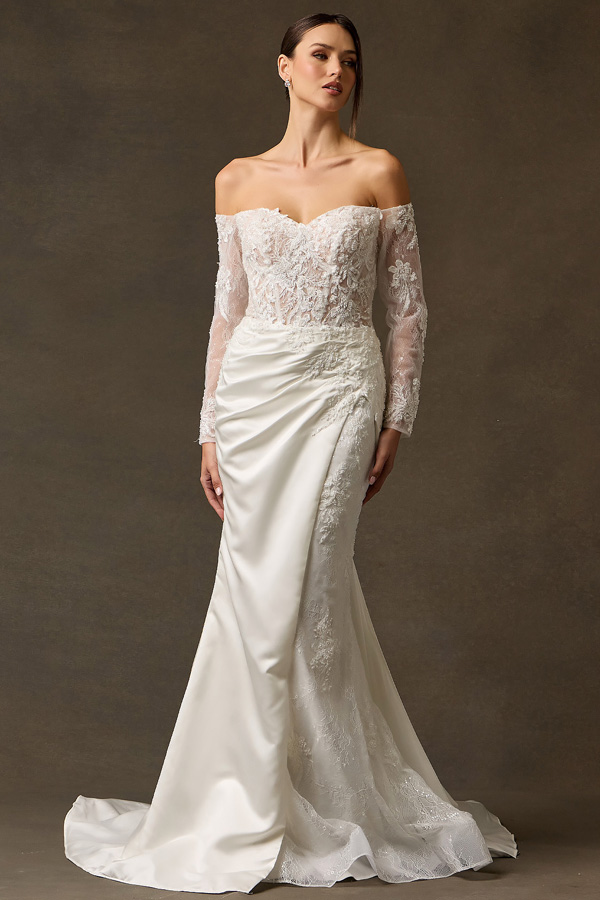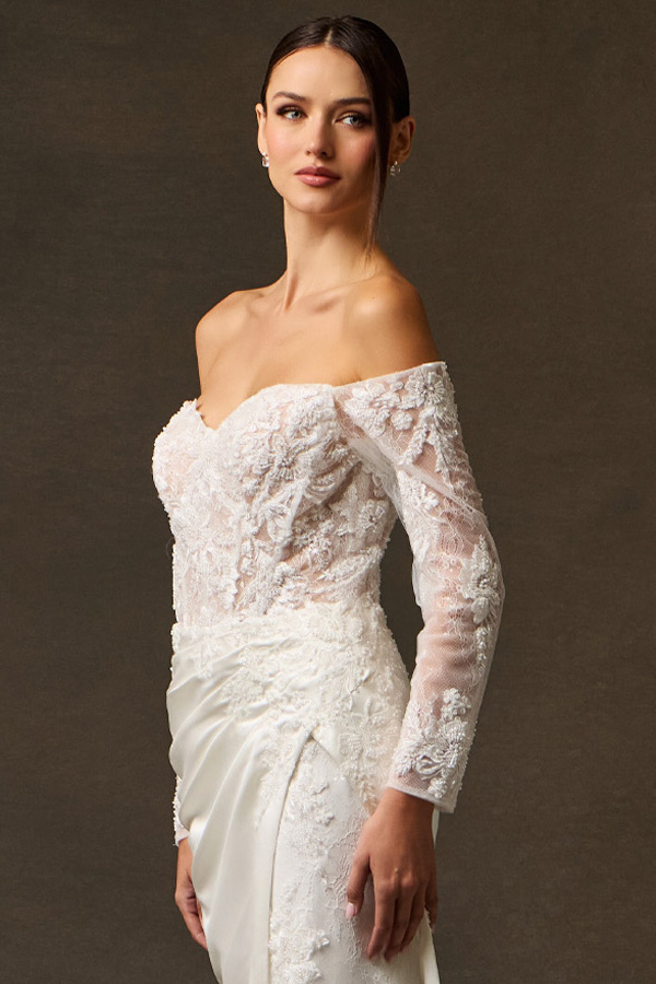 - Off-The-Shoulder Lace Draped Satin Trumpet Wedding Gown