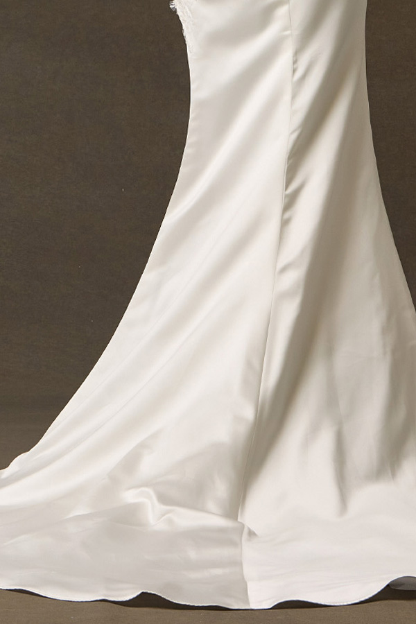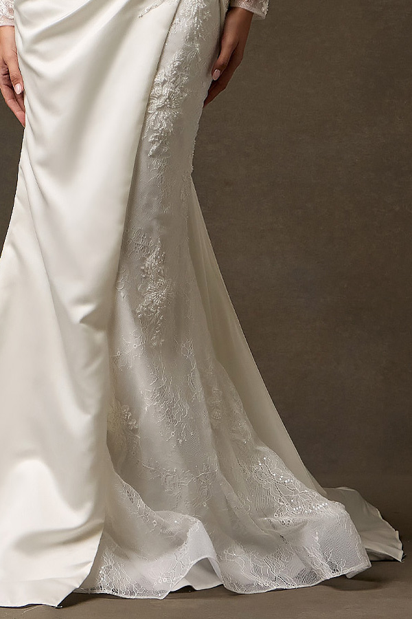 Features: Sheer floral lace, Fabric Covered Buttons. The lower half is a fit-and-flare silhouette made of heavy, luminous satin. It features dramatic asymmetrical draping and pleating across the hips, which gathers into a sophisticated side wrap effect. Fine lace appliqués bleed from the bodice onto the upper hips, creating a seamless transition between the two fabrics. The rear features a low-V illusion lace back with a hidden zipper closure. The satin skirt flows into a graceful, rounded chapel-length train.
