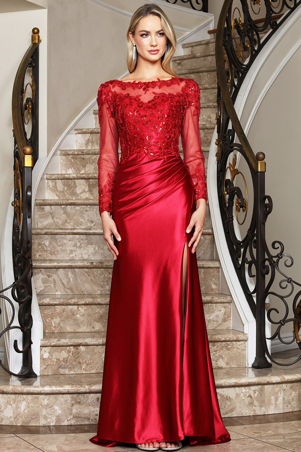 Laced Sheer Long Sleeve Illusion Boat Neckline Satin Evening Dress.