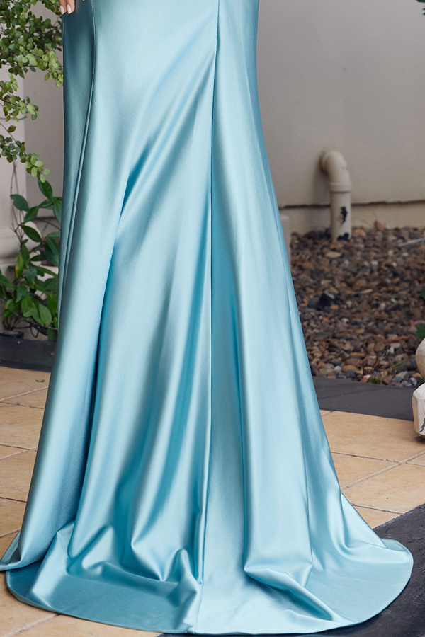 Thigh-High Side Slit, Lace-Up Closure, Sweep Length.Colors: Royal Blue, Sage Green, Silver.