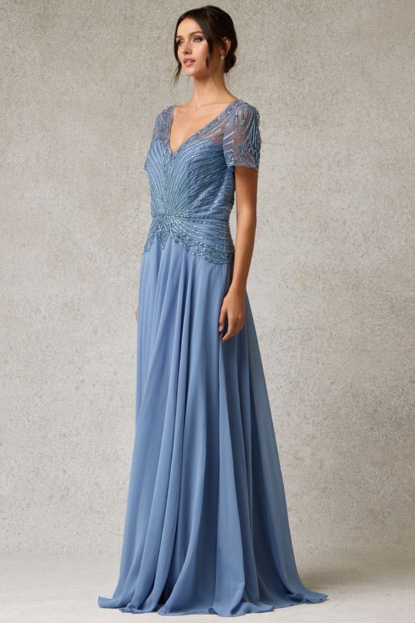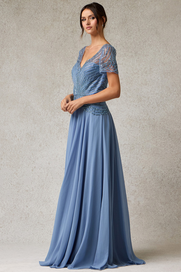 - Short Sleeve Deep V Neck A Line Chiffon MoB Dress
