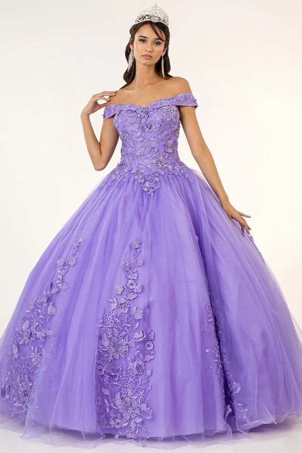 • Floral Embroidery and Jewel Embellished V-Neck Mesh Ball Gown