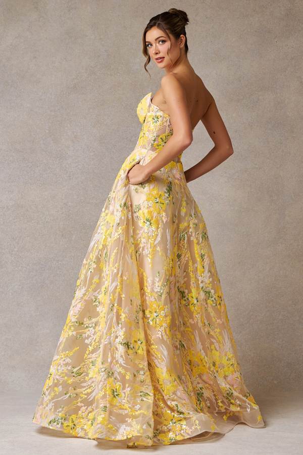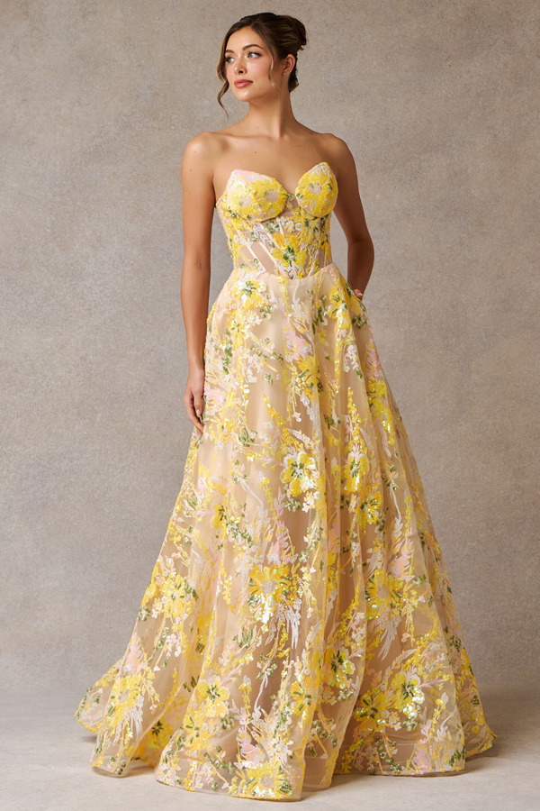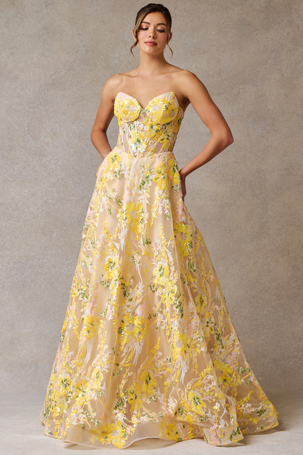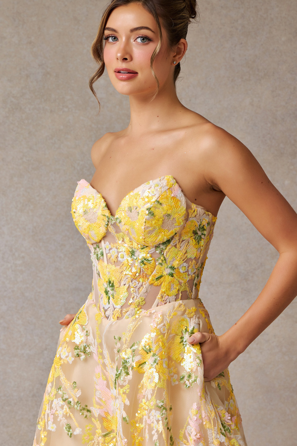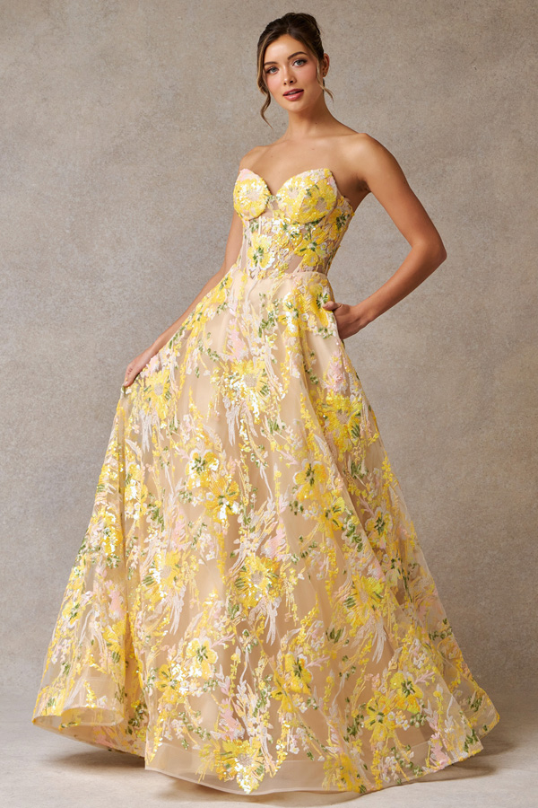 Embellished Strapless Sweetheart A Line Dress w/ Sequin Embroidery over Tulle.