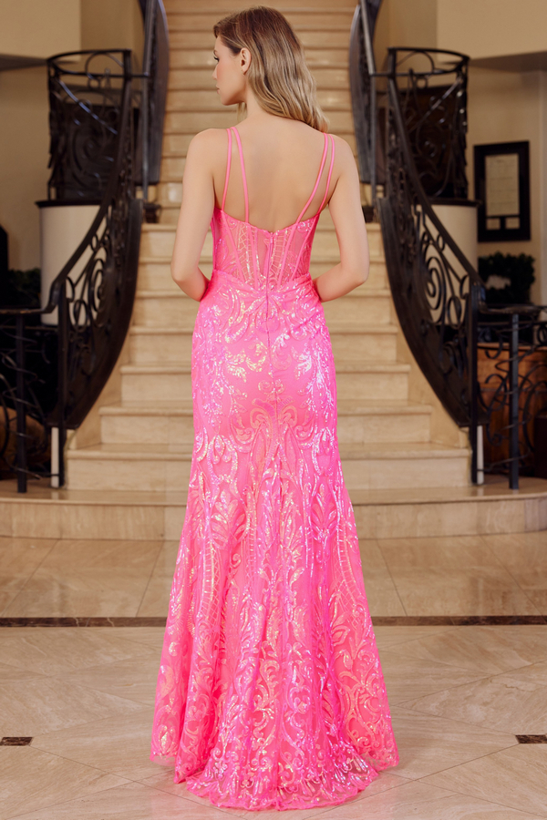Color: HOT PINK Size:Sleeveless Double Spaghetti Straps, Bustier Illusion Top Sequin over Tulle Dress.