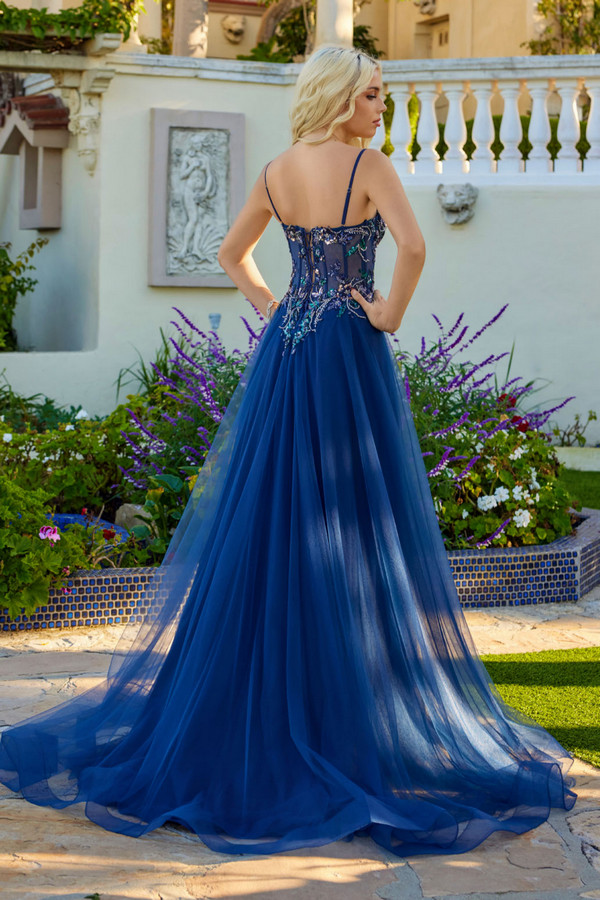 Strapless A-line gown with a structured corset bodice featuring defined cup shaping, sheer paneling, and intricate embellishment placed along the waist and upper skirt. Skirt is layered in soft tulle and designed with a front slit for ease of movement. Back includes a lace-up closure integrated into the corset for adjustable support and a smooth fit. Hem extends into a light, flowing train.