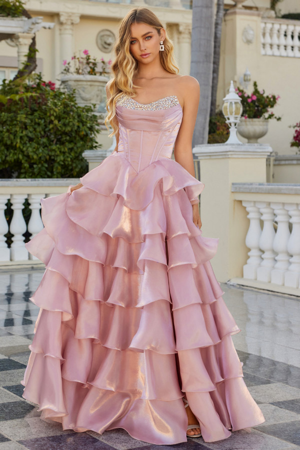 Moonlight Organza Ruffled gown with tiered skirt, structured bodice, sweetheart neckline, embellished neckline trim, corset-style construction, lace-up back closure, and front leg slit.
