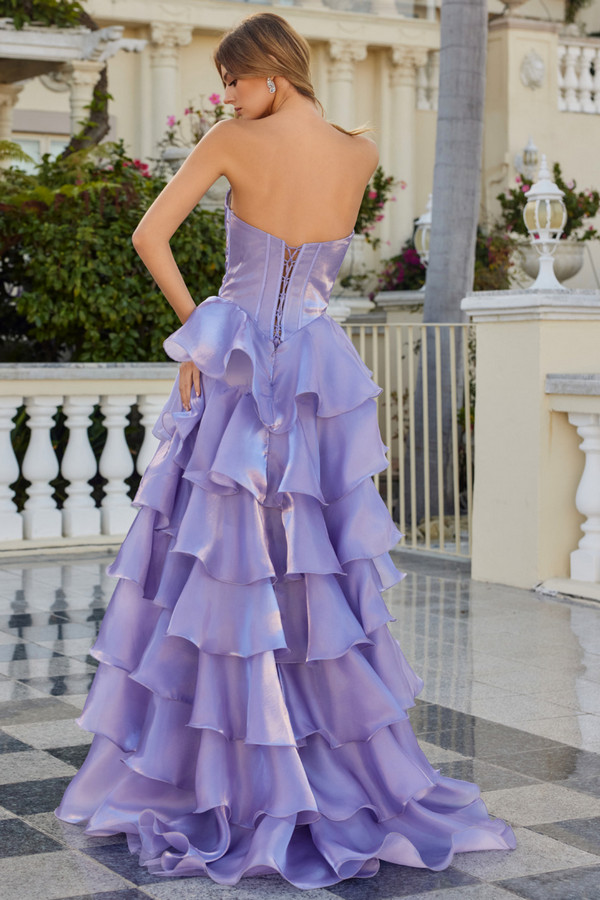 Moonlight Organza Ruffled gown with tiered skirt, structured bodice, sweetheart neckline, embellished neckline trim, corset-style construction, lace-up back closure, and front leg slit.