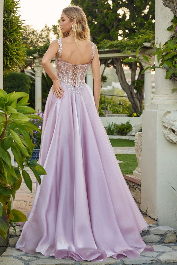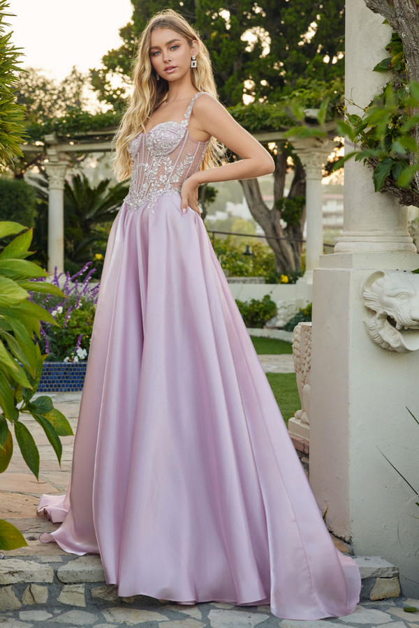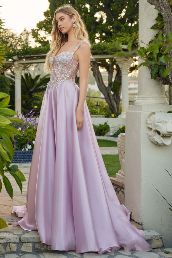 A-line gown with a structured corset bodice featuring defined cup shaping, sheer paneling, and appliqué placed along the neckline and waist. Wide embellished straps frame the top and support a lace-up back closure that adjusts the fit. Full skirt flows from the waist with a smooth, voluminous drape that extends into a soft train.