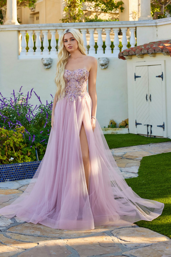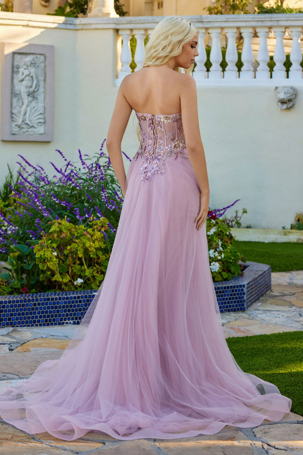 Strapless A-line gown with a structured corset bodice featuring defined cup shaping, sheer paneling, and intricate embellishment placed along the waist and upper skirt. Skirt is layered in soft tulle and designed with a front slit for ease of movement. Back includes a lace-up closure integrated into the corset for adjustable support and a smooth fit. Hem extends into a light, flowing train.