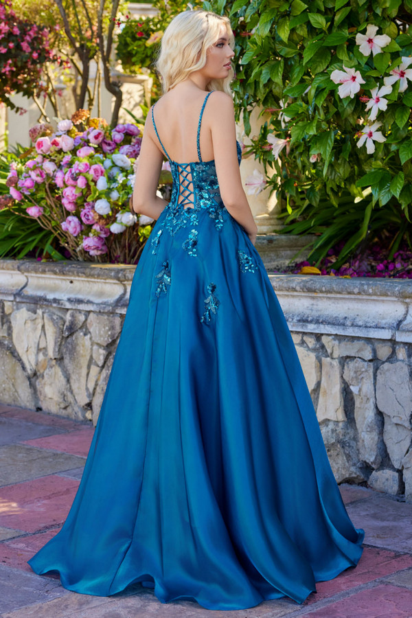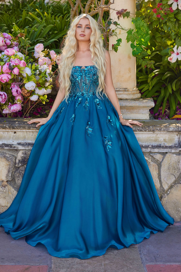Color: TEAL Size:- Sequin Floral Applique Top A Line Prom Gown